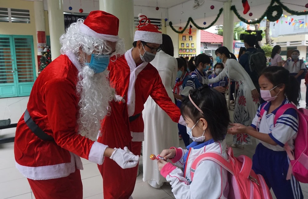 Để tạo hứng khởi khi bước vào học tuần học mới, 2 giáo viên hóa trang thành ông già Noel để tặng quà cho các em.