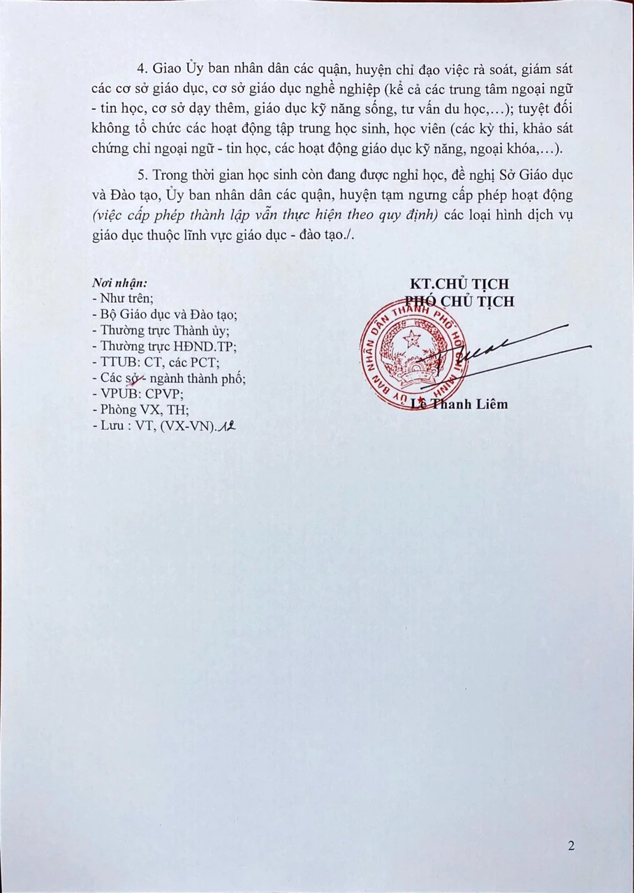 Giao UBND các quận, huyện chỉ đạo các cơ sở giáo dục, cơ sở giáo dục nghề nghiệp ( kể cao các trung tâm ngoại ngữ, tin học, cơ sở dạy thêm, giáo dục kỹ năng sống, tư vấn du học…) tuyệt đối không tổ chức các hoạt động tập trung học sinh, học viên.
