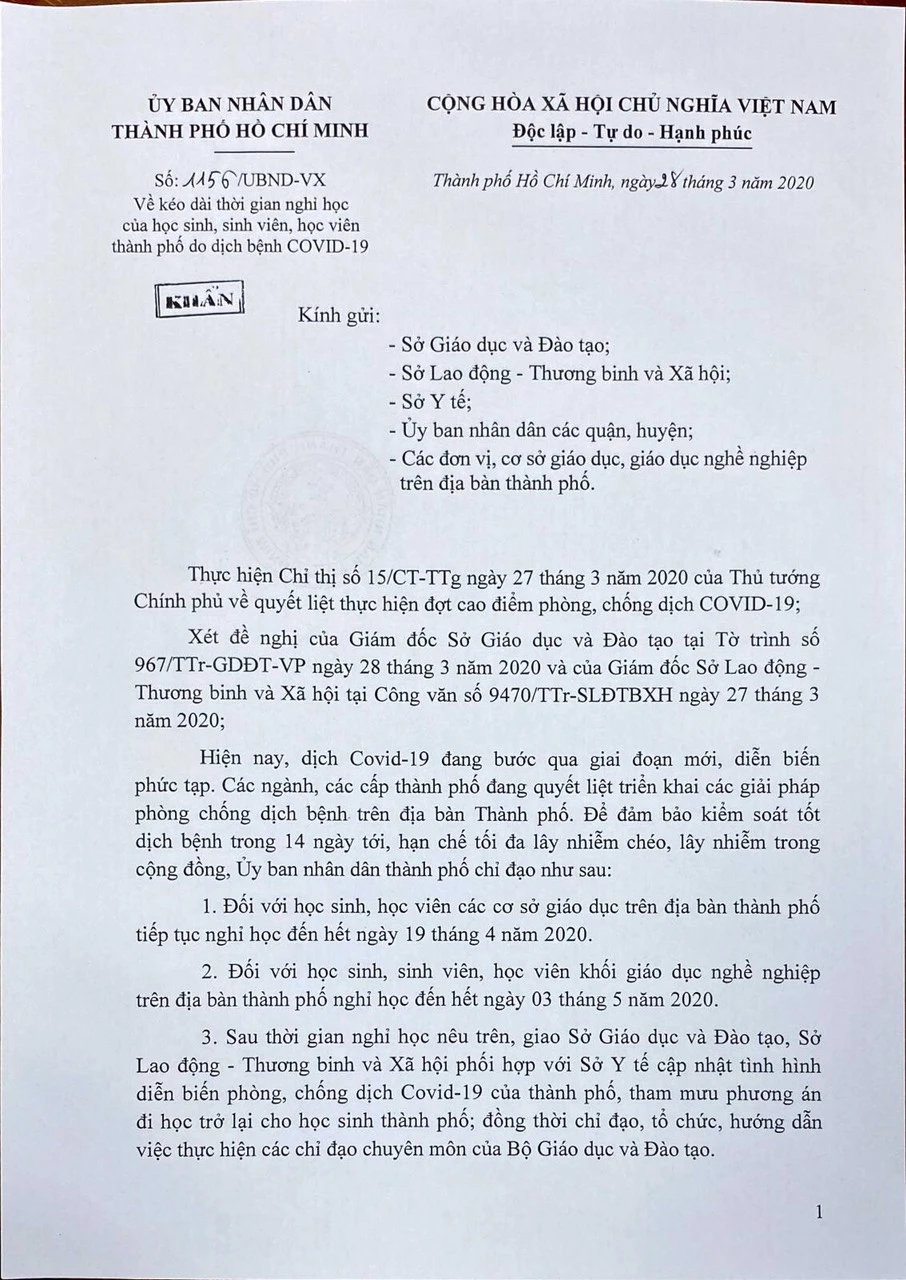 Đối với học sinh, sinh viên, học viên khối giáo dục nghề nghiệp trên địa bàn TP.HCM nghỉ học đến hết ngày 3-5-2020.