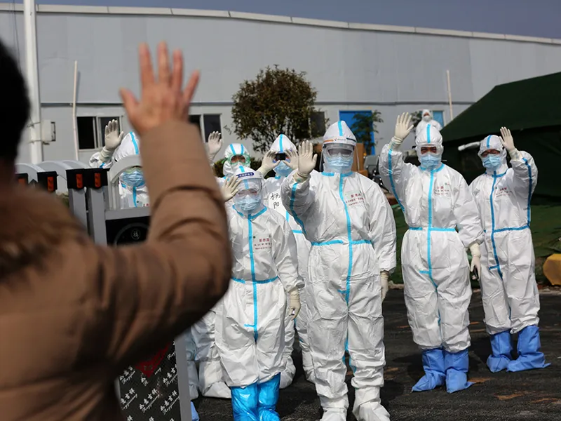 Một bệnh nhân COVID-19 được xuất viện sau khi điều trị thành công vẫy tay chào các nhân viên y tế tại BV Leishenshan, TP Vũ Hán (Trung Quốc) ngày 1-3. Ảnh: CCTV