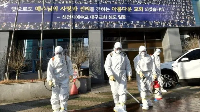 Các nhân viên y tế khử trùng khu vực nhà thờ nơi liên hệ với ít nhất 83 ca nhiễm virus COVID-19 tại Hàn Quốc. Ảnh: ARIRANG