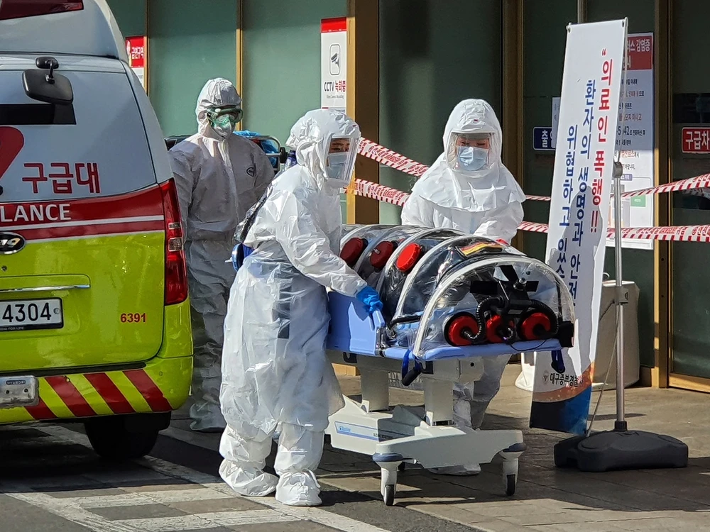 Một bệnh nhân nghi nhiễm virus COVID-19 được đưa đến cách ly tại một bệnh viện ở Daegu. Ảnh: YONHAP