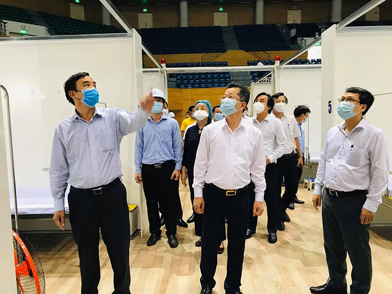 Ông Nguyễn Văn Quảng (giữa), Phó Bí thư thường trực Thành ủy Đà Nẵng, kiểm tra BV dã chiến Tiên Sơn chiều 11-8. Ảnh: TẤN VIỆT