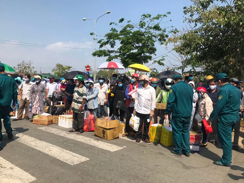 Chủ tịch Nguyễn Thành Phong: “Để tình hình tập trung đông người tiếp tế là không thể chấp nhận được”. Trong ảnh: Người nhà xếp hàng dài gửi tiếp tế cho người cách ly tại ký túc xá ĐH quốc gia sáng 23-3. Ảnh: KD