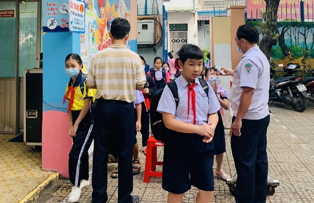 Tại trường Tiểu học Trần Quang Khải, quận Gò Vấp, trước khi vào lớp, học sinh xếp thành hai hàng, đảm bảo giãn cách, được đo thân nhiệt và xịt nước rửa tay.