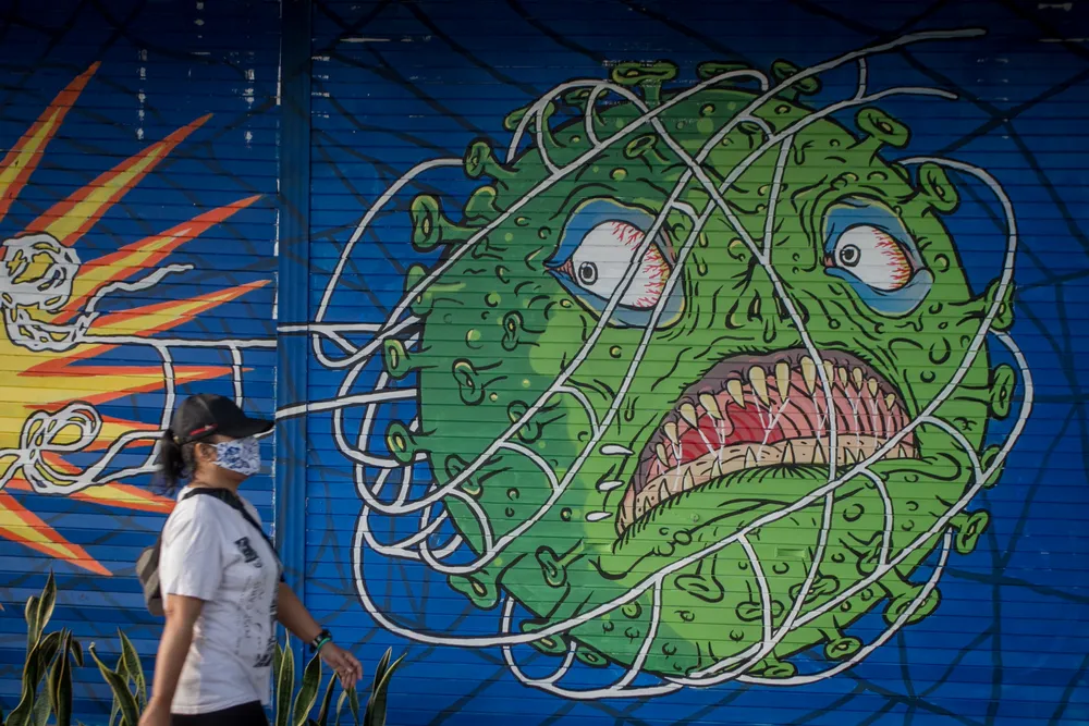 Một người phụ nữ đeo khẩu trang đi ngang qua bức tranh chủ đề COVID-19 khi dịch bệnh tiếp tục bùng phát trên hòn đảo Java, Indonesia, ngày 21-2. Ảnh: REUTERS