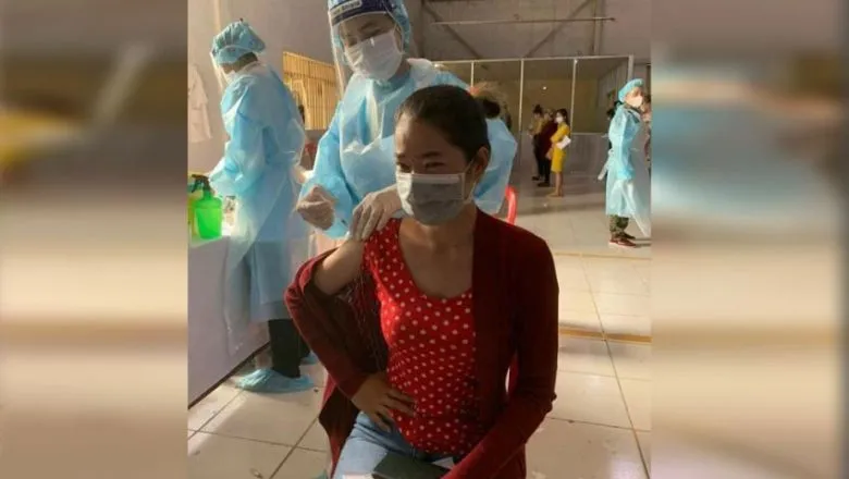 Một nữ công nhân, 23 tuổi, hôm 14-5 đã trở thành người thứ 2.000.000 được tiêm vaccine ngừa COVID-19 tại Cambodia. Ảnh: THE STAR