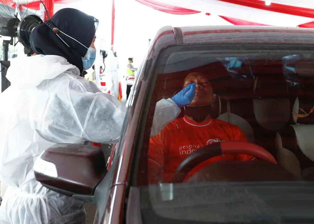 Nhân viên y tế Indonesia lấy mẫu xét nghiệm COVID-19 cho những người trở về thủ đô Jakarta sau dịp lễ Eid. Ảnh: REUTERS