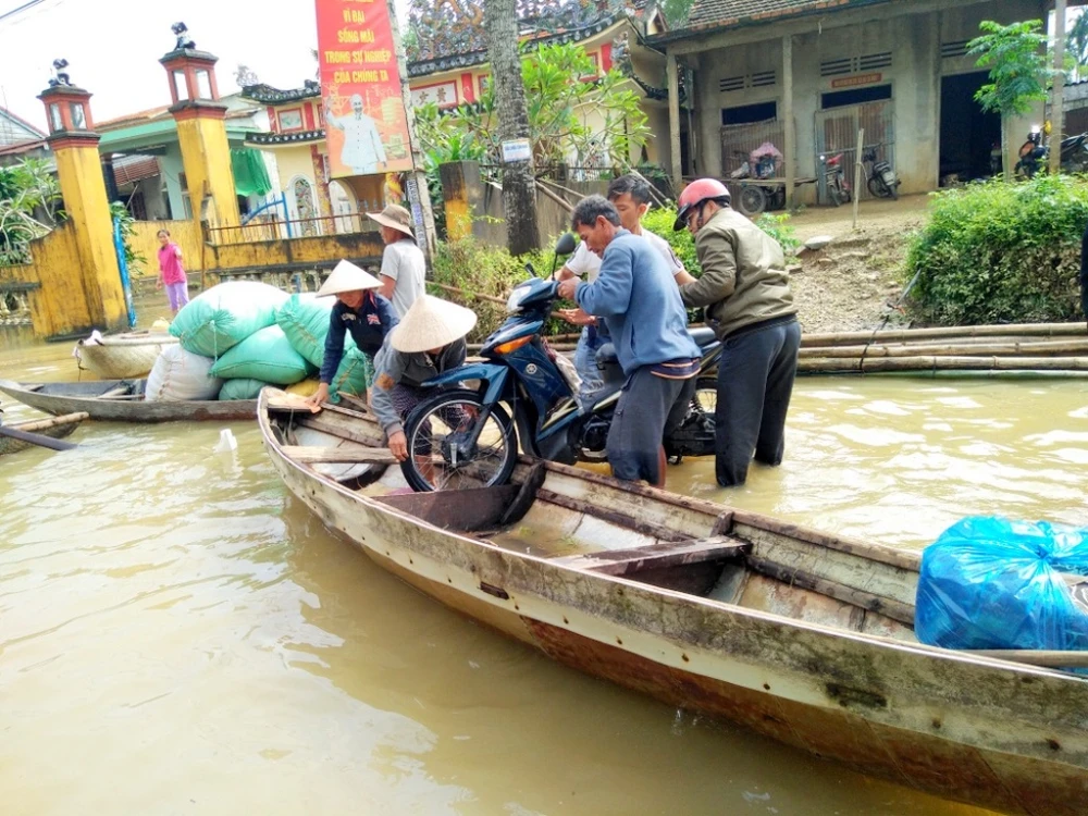 Rất nhiều người cùng phương tiện được những chủ ghe đưa qua đoạn ngập nước an toàn vì giao thông bị chia cắt. Ảnh: HUY TRƯỜNG