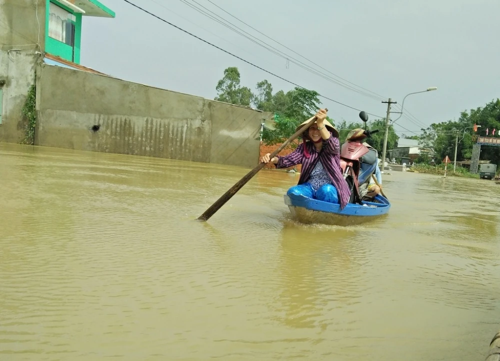 Một người dân xã Điện Phong dùng ghe chở khách qua đoạn ngập để kiếm tiền mưu sinh. Ảnh: HUY TRƯỜNG