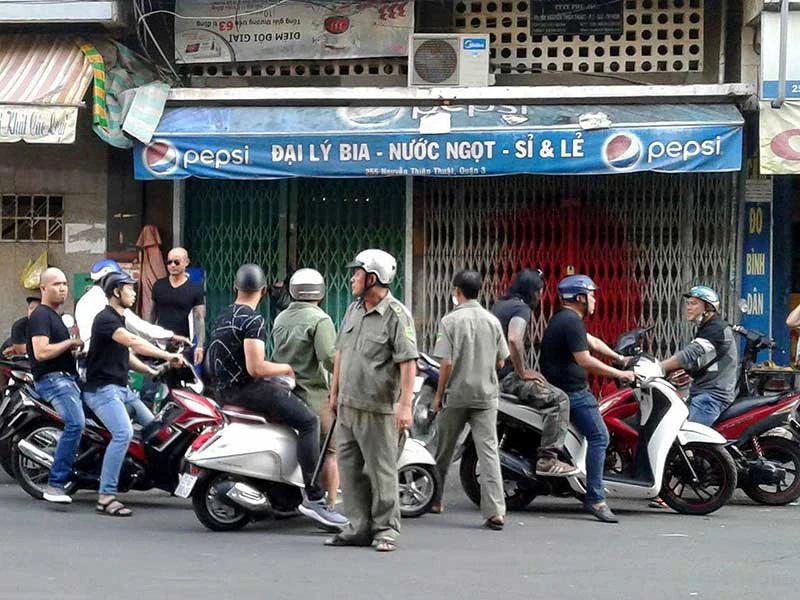 Nhiều người mặc áo đen của một công ty thu hồi nợ đến nhà một người dân ở quận 3, TP.HCM đòi nợ khiến cả khu phố nhốn nháo. Ảnh: NGUYỄN TRÀ