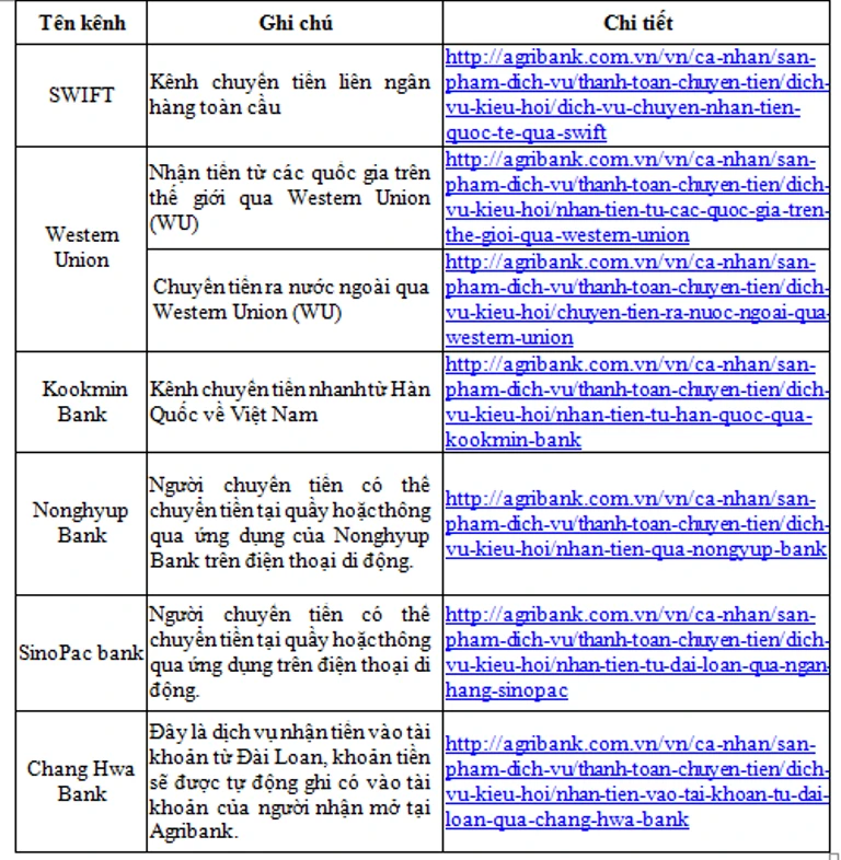 Không chỉ cung cấp dịch vụ nhận/chuyển tiền kiều hối qua Western Union, Agribank còn hợp tác với nhiều ngân hàng nhằm cung cấp dịch vụ chuyển và nhận tiền kiều hối đa dạng từ nhiều quốc gia, với nhiều hình thức khác nhau như: Nhận tiền từ Hàn Quốc qua Kookmin Bank, Nonghyup Bank, Nhận tiền từ Đài Loan qua Ngân hàng SinoPac, Chang Hwa Bank... Cùng với đó, Agribank đã và đang thiết lập quan hệ tài khoản trực tiếp và ký Thỏa thuận hợp tác trong lĩnh vực kiều hối với các ngân hàng lớn tại nhiều quốc gia và vùng lãnh thổ. Quý khách hàng có thể lựa chọn các ngân hàng là đối tác với Agribank để chuyển tiền về Việt Nam nhanh chóng, an toàn và tiết kiệm chi phí.