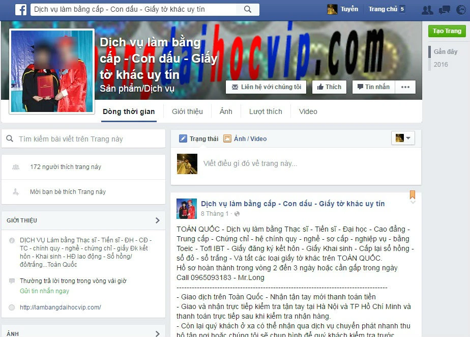 Một trang Facebook có tên “Làm bằng giả” có nội dung quảng cáo nhận làm bằng đại học và giấy tờ các loại, không phải đặt cọc, giá gốc và uy tín.