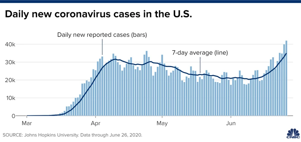 Biểu đồ hiển thị độ tăng giảm nhiễm mới COVID-19 ở Mỹ. Ảnh: CNBC