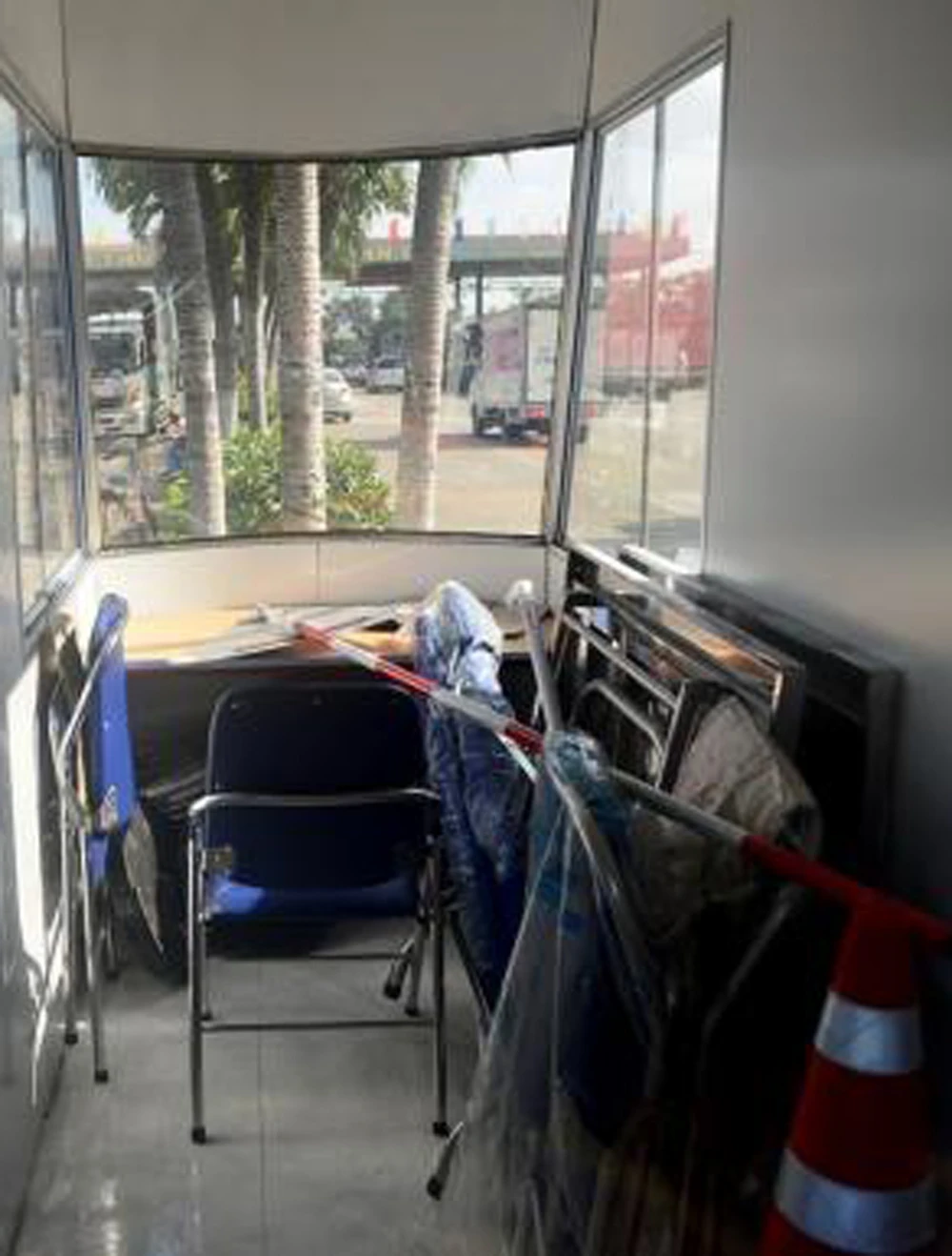 Qua khe cửa hẹp, nhìn vào bên trong cabin thì thấy ngổn ngang những bàn với ghế, gậy chỉ huy, điều tiết giao thông và cọc tiêu mềm của trạm cân được vứt vung vãi ...