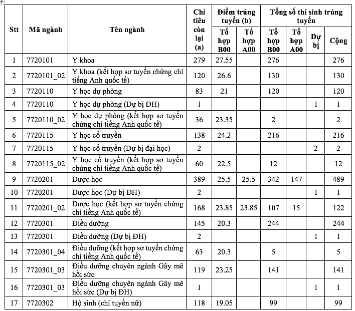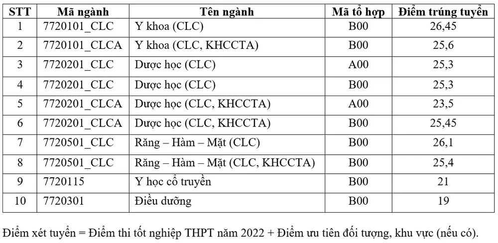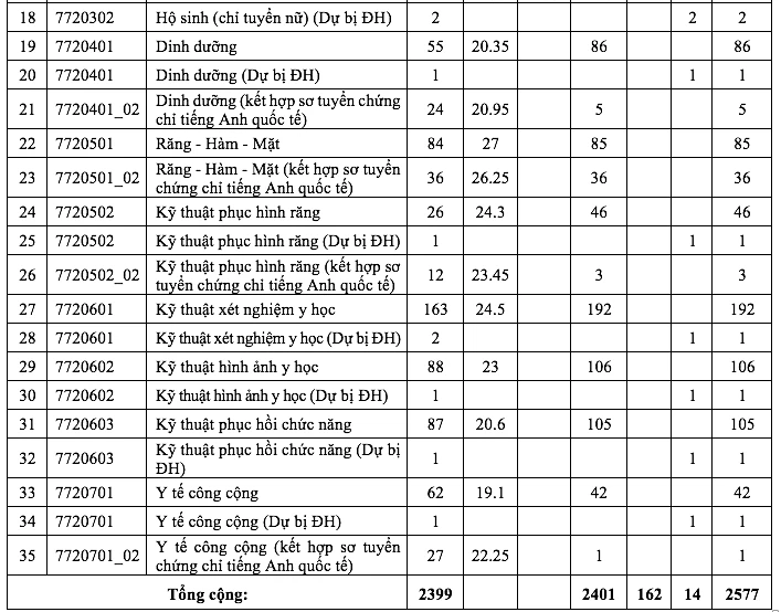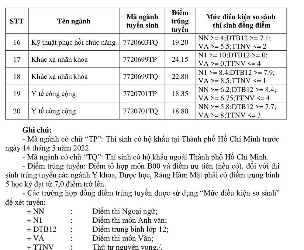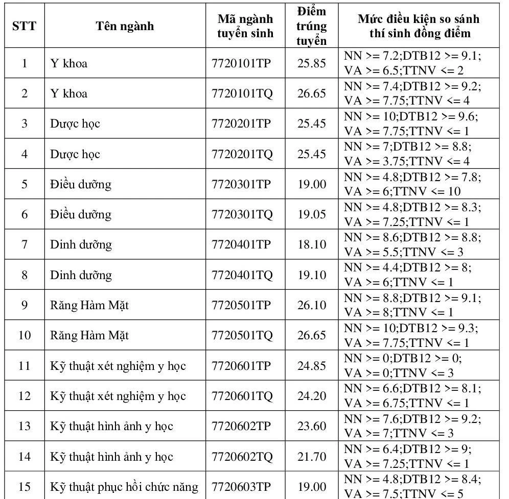 Y khoa vẫn là ngành cao điểm nhất dành cho nhóm thí sinh toàn quốc, còn với thí sinh hộ khẩu TP.HCM thấp hơn là 25,85 điểm. Thấp nhất là ngành Kỹ thuật phúc hồi chức năng với 19 điểm dành cho thí sinh tại TP.HCM. So với năm trước, điểm chuẩn thấp hơn hẳn, như ngành Y khoa giảm 0,7 điểm, các ngành khác cũng tương tự. Cụ thể điểm từng ngành như sau: