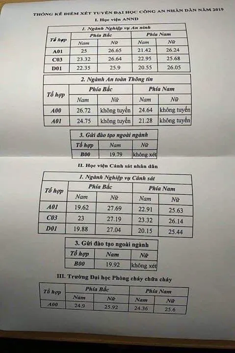 Đối với Học viện An ninh Nhân dân khu vực phía Bắc: Ngành Nghiệp vụ an ninh có điểm chuẩn dao động từ 22.35 (tổ hợp D01) đến 25 điểm (tổ hợp A01) đối với nam. Khu vực phía Nam: Điểm chuẩn thấp hơn với 20.55 (tổ hợp D01), 22.95 (tổ hợp C03), 21.42 điểm (tổ hợp 21.42) đối với nam.