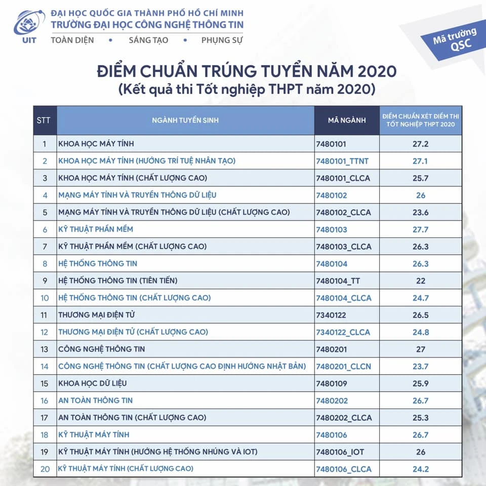 Chiều tối ngày 4-10, Trường ĐH Công nghệ thông tin (ĐH Quốc gia TP.HCM) đã chính thức công bố điểm chuẩn đại học theo phương thức xét điểm thi tốt nghiệp THPT.