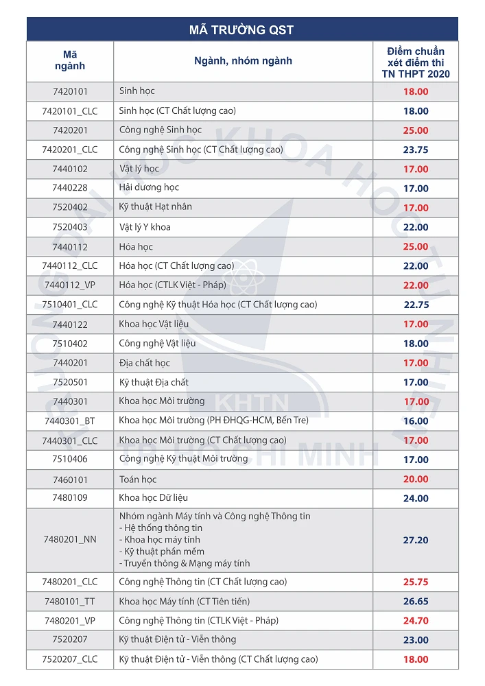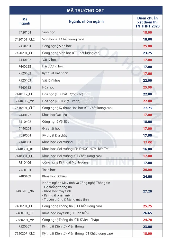 Sáng 5-10, Trường Đại học Khoa học Tự nhiên, (ĐH Quốc gia TP.HCM) đã công bố điểm chuẩn bậc đại học hệ chính quy dựa trên kết quả kỳ thi tốt nghiệp THPT năm 2020.