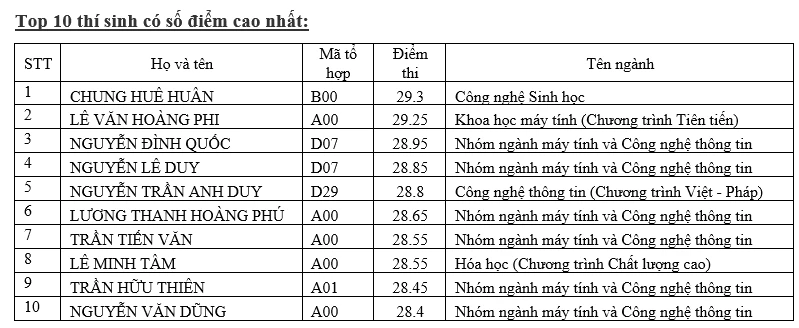 Hai thí sinh có số điểm cao nhất là em Chung Huê Huân, ngành Công nghệ Sinh học, tổ hợp B00 29.30 điểm và em Lê Văn Hoàng Phi, chương trình Tiên tiến Khoa học máy tính, tổ hợp A00 29.25 điểm.