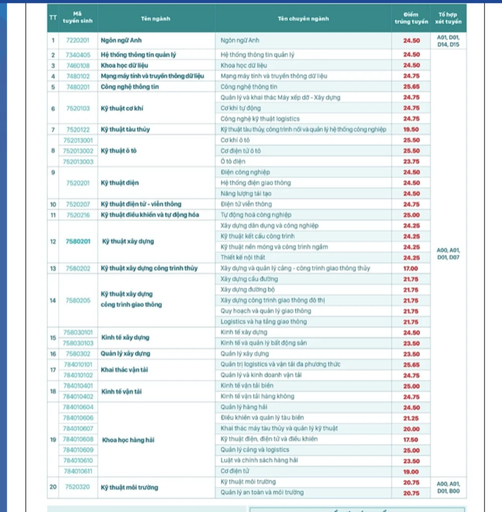 Đối với điểm trúng tuyển sử dụng kết quả thi tốt nghiệp THPT 2023 chương trình chuẩn, ngành CNTT và ngành khai thác vận tải ( chuyên ngành quản trị logistics và vận tải đa phương thức) có điểm chuẩn cao nhất với 25,65 điểm. Ngược lại, thấp nhất là ngành kỹ thuật xây dựng công trình với 17 điểm.