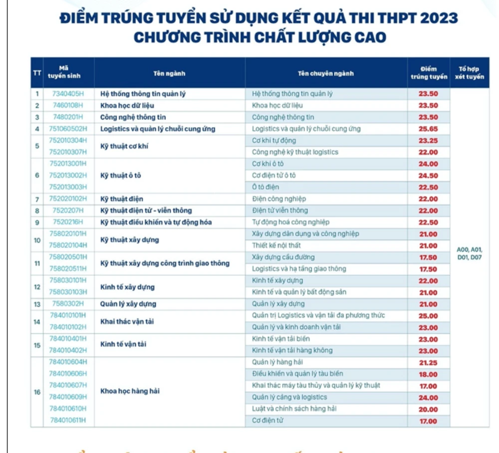 Đối với điểm chuẩn đại học chương trình chất lượng cao, logistics và quản lý chuỗi cung ứng có điểm cao nhất 25,65 điểm. Thấp nhất chuyên ngành khai thác máy tàu thuỷ và quản lý kỹ thuật và cơ điện tử của ngành khoa học hàng hải với 17 điểm.