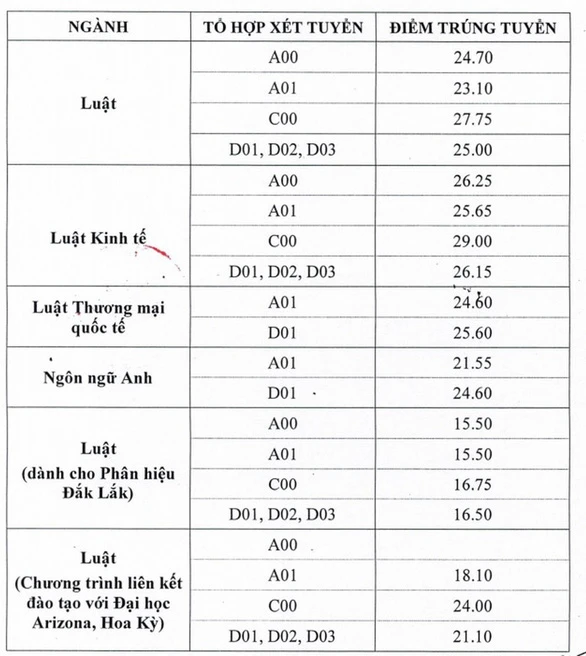 Các ngành còn lại chủ yếu lấy đầu vào 23-25 điểm, riêng các tổ hợp của ngành Luật phân hiệu Đăk Lăk chỉ 15-16, kém ngành cao nhất đến 14 điểm.