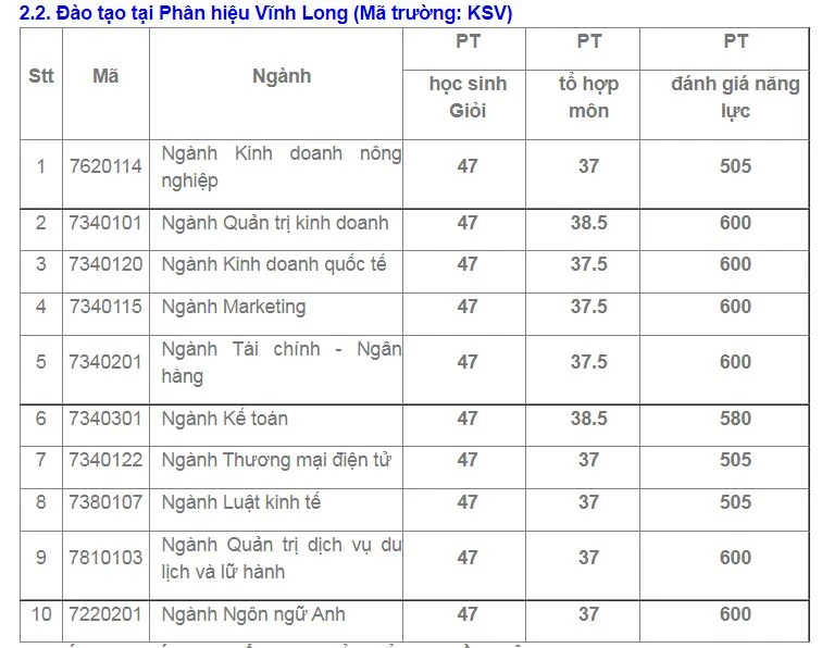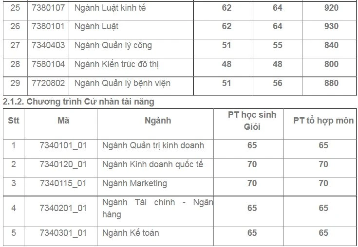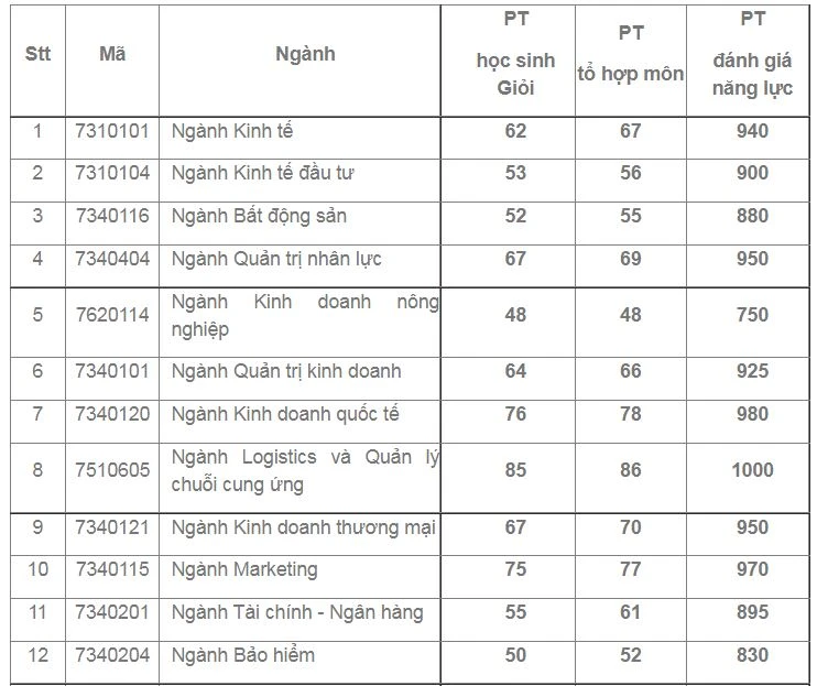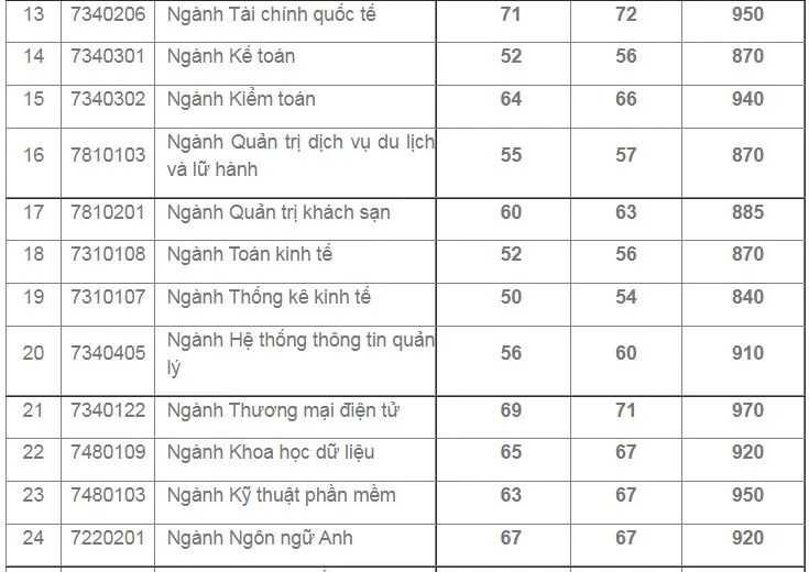Mức điểm các ngành như sau: