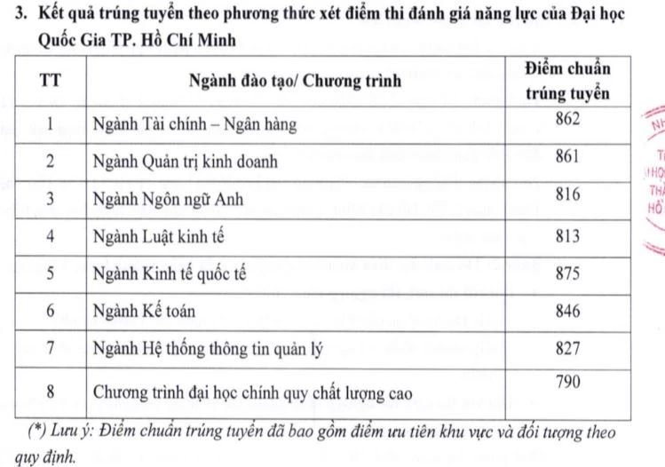 Theo đó, ở phương thức xét điểm thi đánh giá năng lực ĐH Quốc gia TP.HCM, điểm chuẩn trúng tuyển các ngành trong khoảng từ 790 đến 875 điểm. Mức điểm này đã gồm điểm ưu tiên khu vực và đối tượng (nếu có).