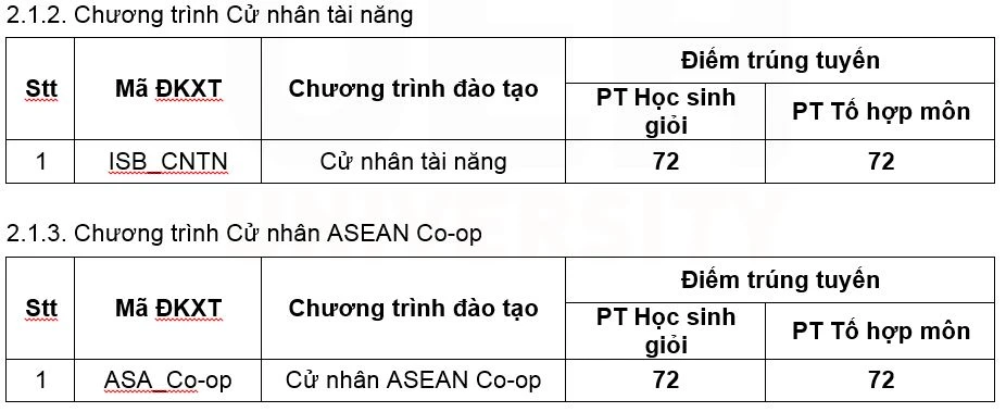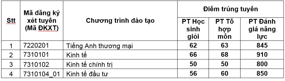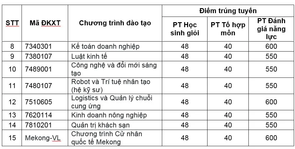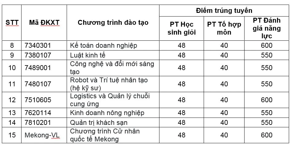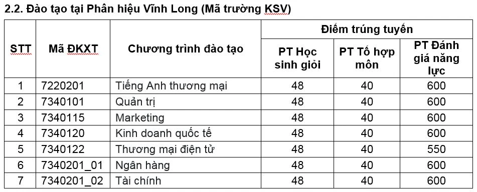 Trường lưu ý thí sinh được trường thông báo thỏa điều kiện điểm trúng tuyển cần thực hiện đăng ký nguyện vọng xét tuyển trên Cổng thông tin tuyển sinh của Bộ GD&ĐT từ ngày 10-7 đến 17 giờ ngày 30-7.Tại Phân hiệu tỉnh Vĩnh Long, các phổ điểm lần lượt là từ 40 – 48 với phương thức xét tuyển học sinh giỏi và tổ hợp môn và điểm đánh giá năng lực từ 550 - 600.