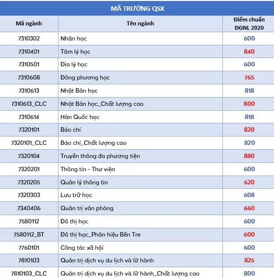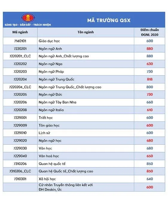 Trong đó, ba ngành có điểm chuẩn cao nhất với 880 điểm, gồm: Ngôn ngữ Anh hệ chuẩn, Ngôn ngữ Anh hệ Chất lượng cao, Truyền thông đa phương tiện. Kế đến là các ngành Quan hệ quốc tế hệ chuẩn, Quan hệ quốc tế hệ Chất lượng cao với 850 điểm. Ngành Tâm lý học và Quản trị dịch vụ du lịch và lữ hành hệ chuẩn cũng có mức điểm khá cao khi lần lượt là 840 điểm và 825 điểm.