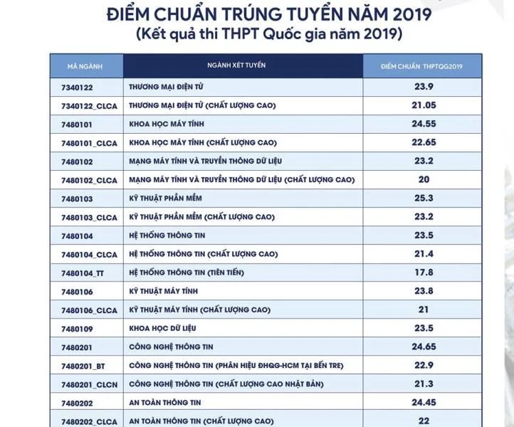 Theo đó, ngành hệ thống thông tin (chương trình tiên tiến) có điểm chuẩn thấp nhất là 17,8 điểm. Ngành điểm chuẩn cao nhất là kỹ thuật phần mềm 25,3 điểm.