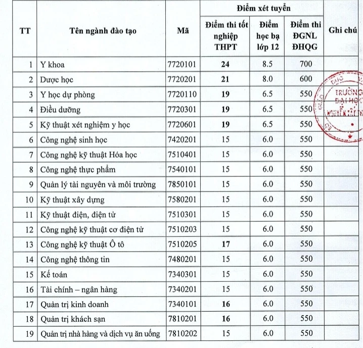 Trong đó, ngành Y khoa có điểm chuẩn cao nhất là 24 điểm tiếp theo là ngành Dược học 21 điểm, Y học Dự phòng, Kỹ thuật Xét nghiệm và Điều dưỡng là 19 điểm, Công nghệ kỹ thuật Ô tô 17 điểm, Quản trị Kinh doanh và Quản trị Khách sạn là 16 điểm, các ngành còn lại có mức điểm chuẩn là 15 điểm.