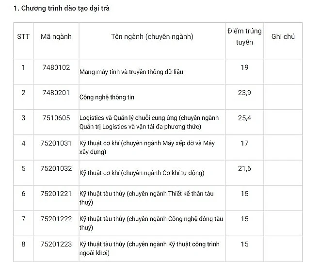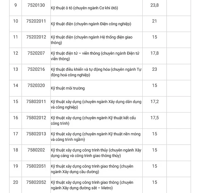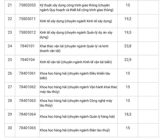 Trong đó, Công nghệ thông tin, Khai thác vận tải và Kỹ thuật ô tô là ba ngành lấy điểm chuẩn cao nhất với lần lượt là 23,9, 23,8 điểm.