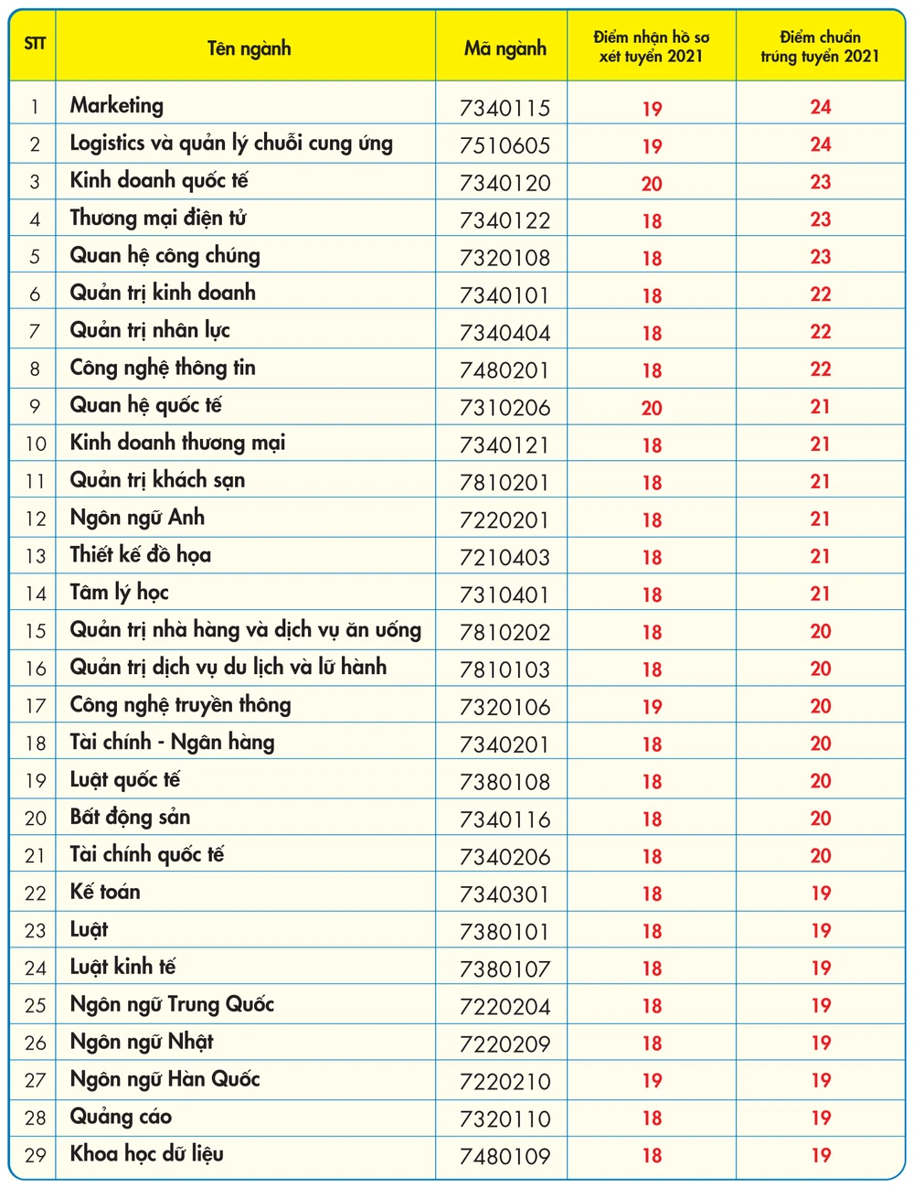 Các ngành Quản trị kinh doanh, Quản trị nhân lực, Công nghệ thông tin có mức điểm trúng tuyển là 22, các ngành Quan hệ quốc tế, Kinh doanh thương mại, Quản trị khách sạn, Ngôn ngữ Anh, Thiết kế đồ họa, Tâm lý học có mức điểm trúng tuyển là 21. Các ngành còn lại dao động từ 19 đến 20 điểm.