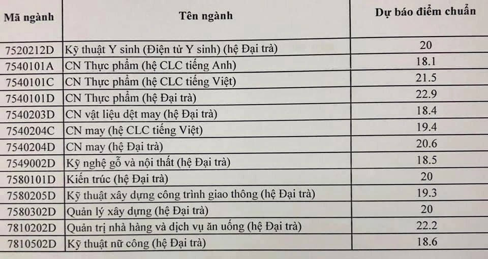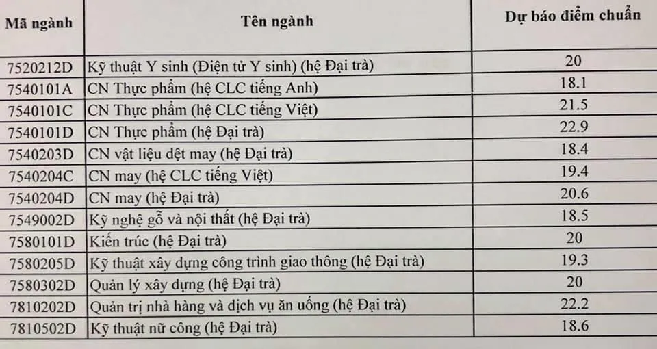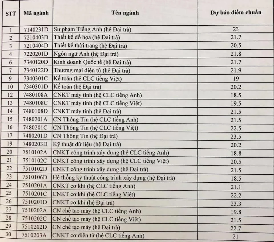 Kế đến là các ngành có điểm chuẩn dự báo từ 23 điểm trở lên ở hệ đại trà như công nghệ thông tin, sư phạm tiếng Anh, công nghệ kỹ thuật cơ điện tử, Công nghệ kỹ thuật ô tô, công nghệ kỹ thuật điện - điện tử và công nghệ kỹ thuật điều khiển và tự động hóa (chất lượng cao). Còn lại trung bình điểm chuẩn dự báo cũng ở mức từ 18-22 điểm.