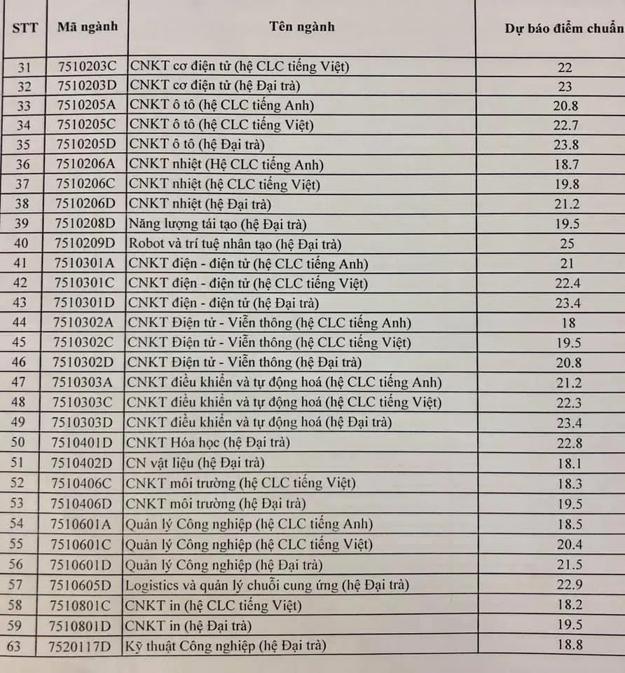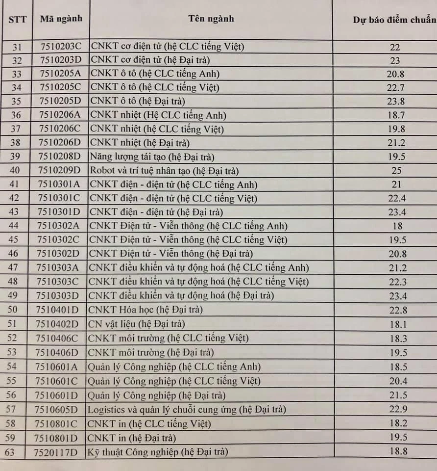 Trong đó, Robot và trí tuệ nhân tạo là ngành có điểm chuẩn dự báo cao nhất với 25 điểm. Đây cũng là ngành có mức điểm sàn cao nhất của trường với 24 điểm vì đây là ngành mới, chỉ tiêu ít nên trường chỉ dành tuyển những thí sinh giỏi nhất và có nguyện vọng học để trường đào tạo miễn phí.