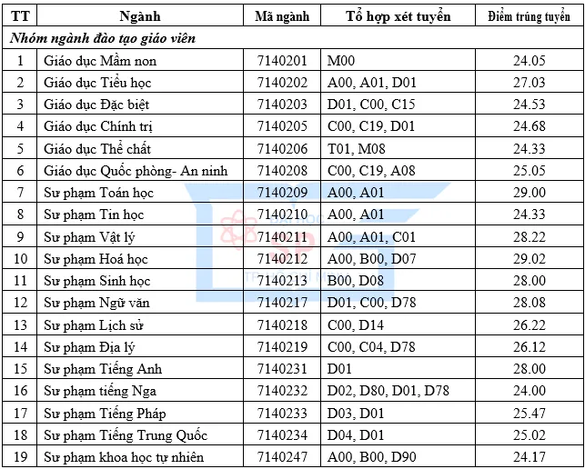 Trong đó, ở nhóm ngành đào tạo giáo viên, ngành sư phạm Hóa học có điểm chuẩn cao nhất với 29,02 điểm. Kế đến là Sư phạm Toán với 29 điểm. Hai ngành là Sư phạm Ngữ văn, Sư phạm tiếng Anh cũng có mức điểm ở top cao với lần lượt là 28,08 điểm và 28 điểm.