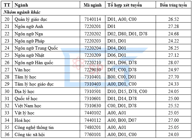 Ở nhóm ngành ngoài sư phạm, ngành Ngôn ngữ Hàn Quốc có điểm cao nhất 28,07 điểm, kế đến là Tâm lý học với điểm chuẩn 27,7 điểm.