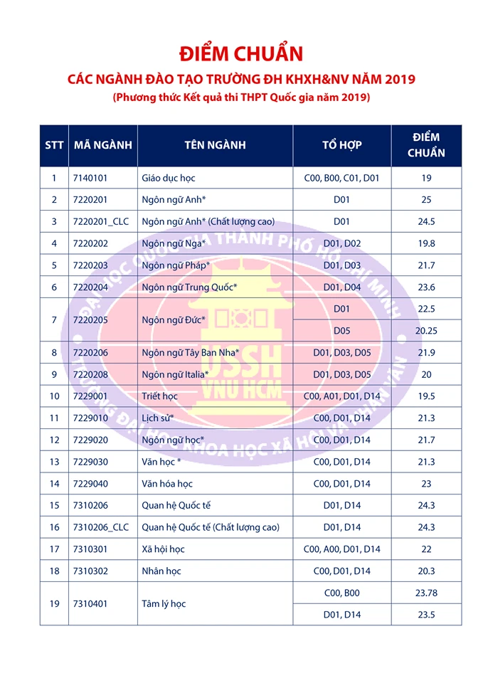 Trong đó, điểm chuẩn cao nhất thuộc về ngành quản trị dịch vụ du lịch và lữ hành (tổ hợp C00) với 25,5 điểm, ngôn ngữ Anh (tổ hợp D01) với 25 điểm. Kế đến là ngành báo chí (tổ hợp C00) với 24,70 điểm, ngôn ngữ Anh hệ chất lượng cao (tổ hợp D01) với 24.5, quản trị dịch vụ du lịch và lữ hành (tổ hợp D01, D14) với 24.5 điểm truyền thông đa phương tiện (tổ hợp D01, D14, D15) với 24.3 điểm, quan hệ quốc tế hệ đại trà và chất lượng cao (tổ hợp D01, D14) với 24.30 điểm, báo chí hệ đại trà (tổ hợp D01, D14) với 24.1 điểm…