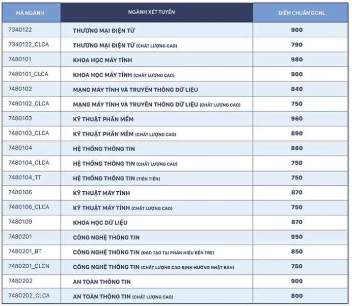 Theo đó, điểm chuẩn dao động từ 750 điểm đến 980 điểm (thang điểm 1.200). Trong đó, Ngành Khoa học máy tính của là ngành có điểm chuẩn đánh giá năng lực cao nhất với 980 điểm. Kế đến là ngành Kỹ thuật phần mềm với 960 điểm và Công nghệ thông tin với 950 điểm.