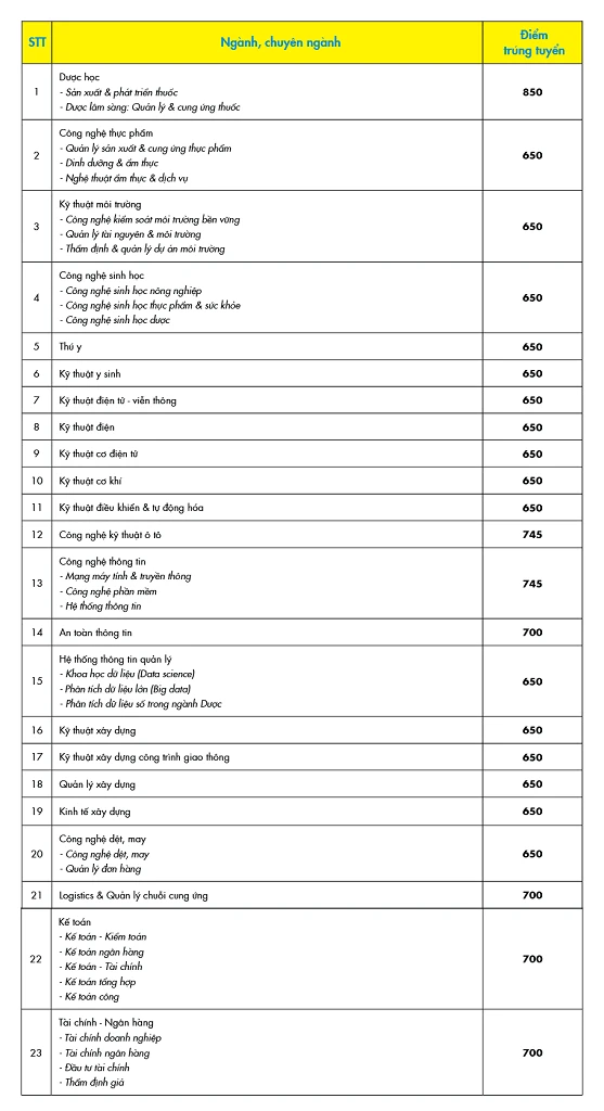 Trong 45 ngành đào tạo trình độ ĐH chính quy của trường, ngành Dược có điểm trúng tuyển cao nhất với 850 điểm (điểm xét tuyển ban đầu là 750 điểm). Kế đến là các ngành Quản trị kinh doanh, Marketing, Kinh doanh quốc tế có điểm trúng tuyển là 780. Ngành Công nghệ kỹ thuật ô tô, Công nghệ thông tin, Quản trị khách sạn, Quản trị dịch vụ du lịch & lữ hành, Ngôn ngữ Anh có điểm trúng tuyển là 745 điểm.