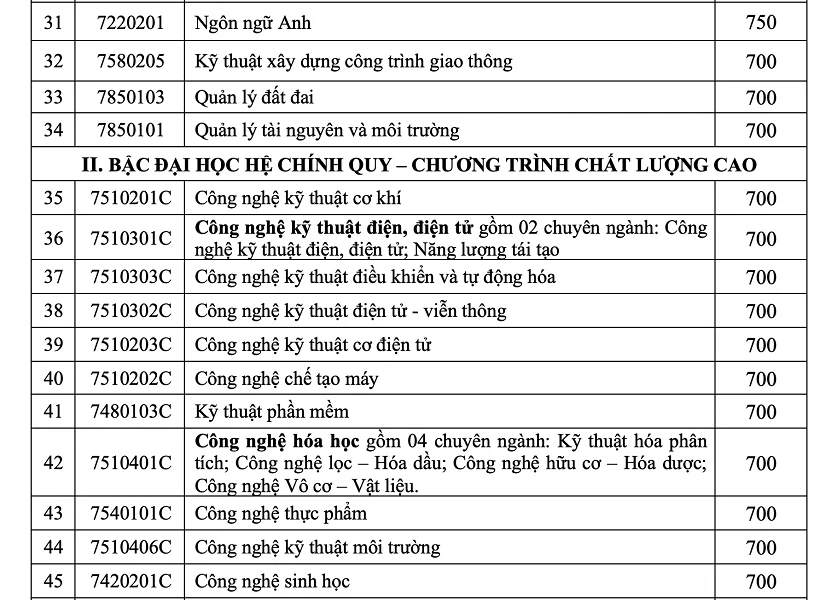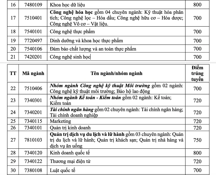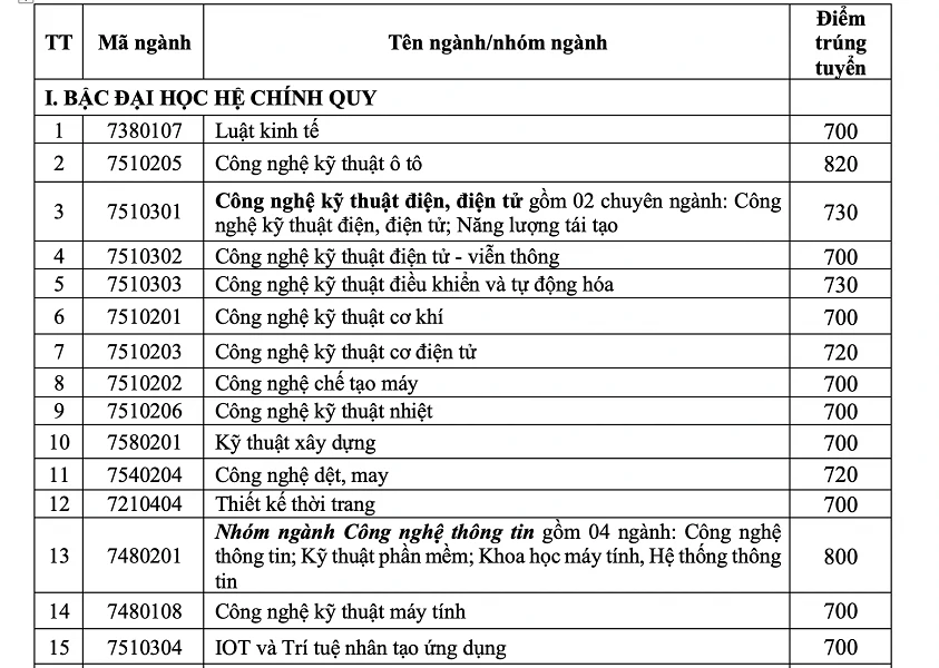Theo đó, trong 50 ngành đào tạo, nhóm ngành công nghệ kỹ thuật ô tô có điểm chuẩn cao nhất với 820 điểm. Kế đến là mức điểm 800 ở các nhóm ngành Công nghệ thông tin, Khoa học dữ liệu, Kinh doanh quốc tế.