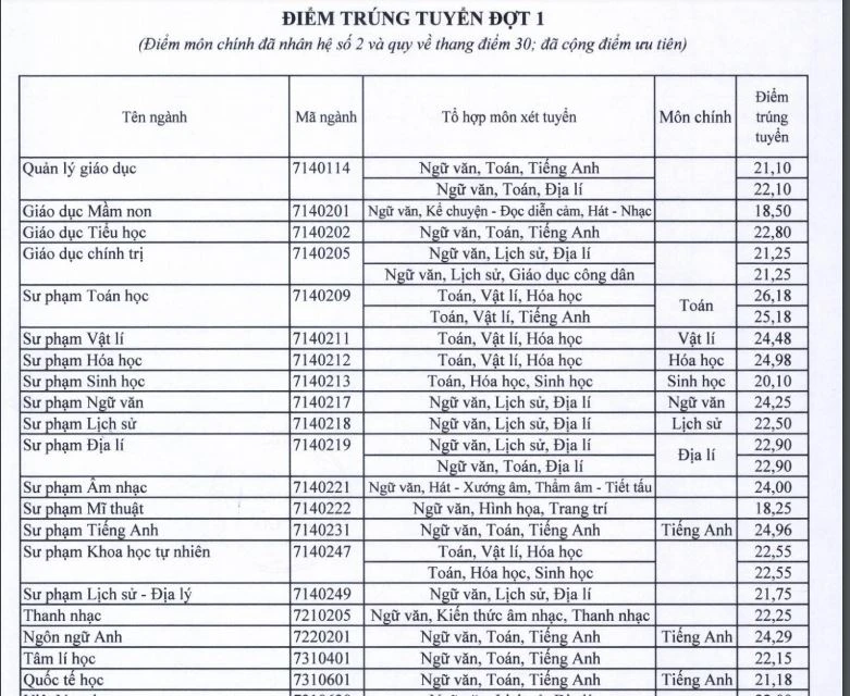 Trong đó, Sư phạm Toán là ngành có điểm chuẩn cao nhất ở nhóm ngành đào tạo giáo viên với 26,18 điểm. Kế đến là các ngành có mức điểm khá cao, trên 24 điểm như Sư phạm tiếng Anh, Sư phạm Vật lý, Sư phạm Hóa Học, Sư phạm Ngữ văn.