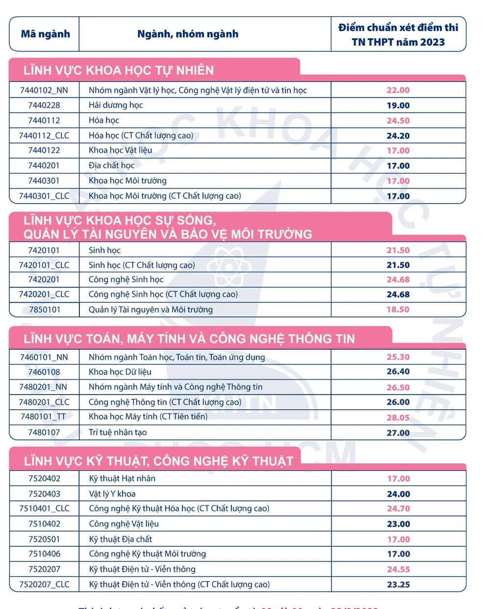 Chiều 22-8, Hội đồng tuyển sinh Trường ĐH Khoa học tự nhiên (ĐH Quốc gia TP.HCM) đã công bố điểm chuẩn theo phương thức xét điểm thi tốt nghiệp THPT năm 2023.