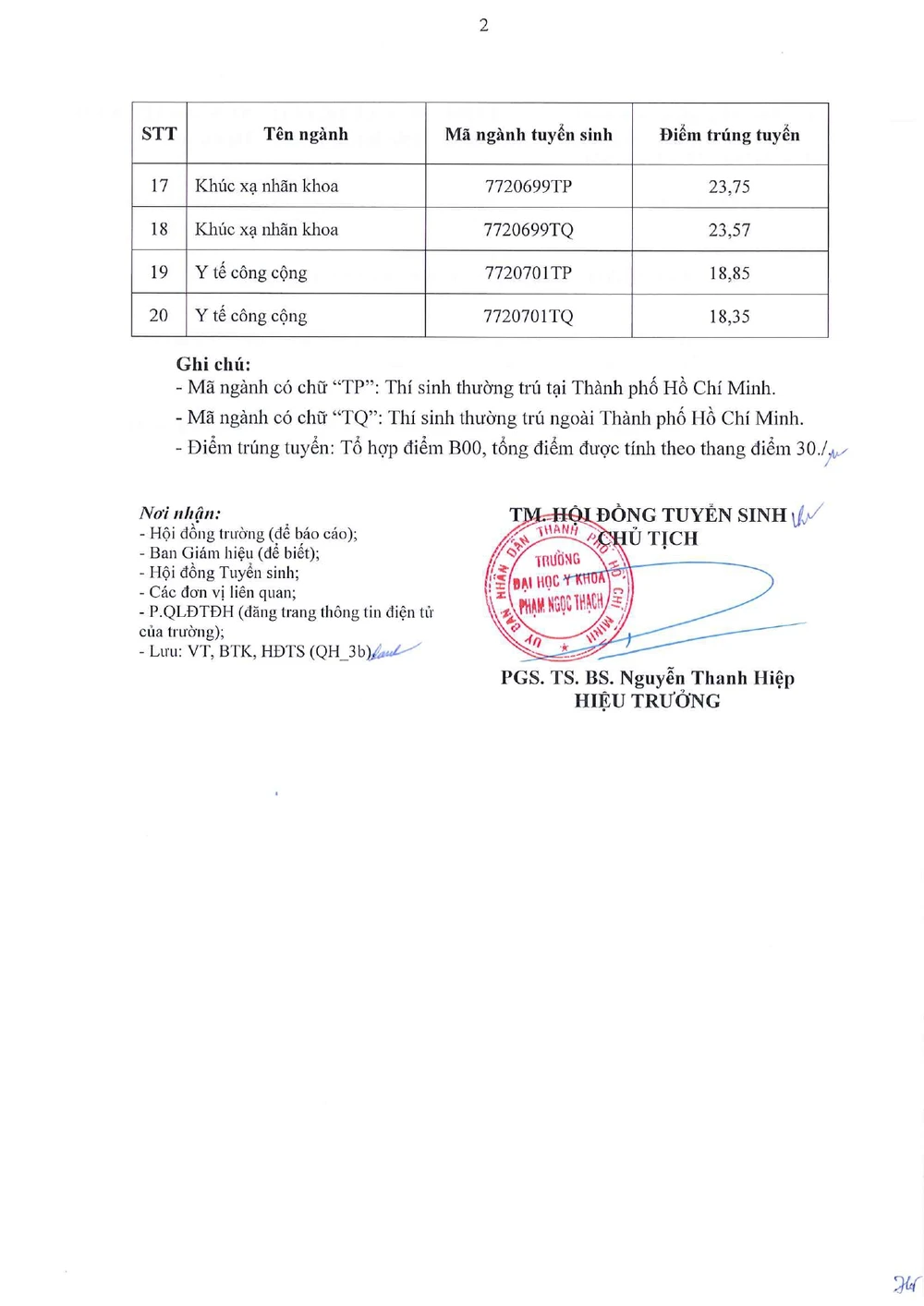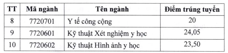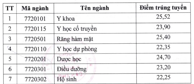 Theo đó, thí sinh trúng tuyển phải có điểm xét tuyển bằng hoặc lớn hơn điểm trúng tuyển quy định vào 10 ngành theo thông báo của trường. Trong đó, điểm chuẩn cao nhất là ngành Y khoa với 25,52 điểm và điểm chuẩn thấp nhất là ngành Y tế công cộng với 20 điểm.