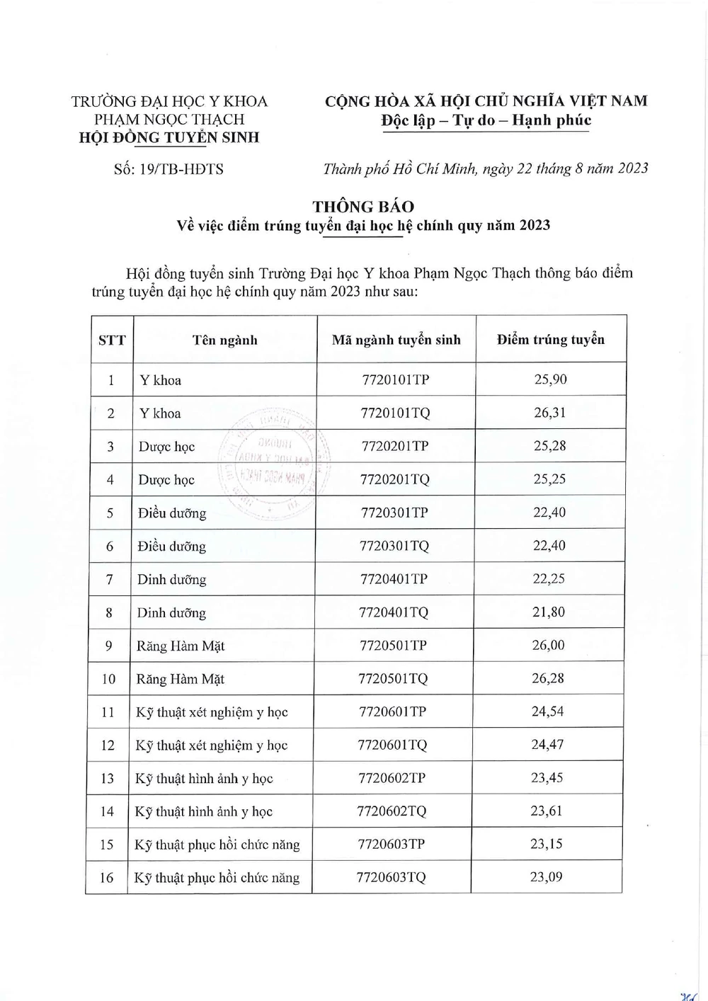 Chiều 22-8, Hội đồng tuyển sinh Trường Đại học Y Dược (ĐHYD) Cần Thơ có thông báo về điểm trúng tuyển đại học chính quy năm 2023 theo phương thức xét điểm thi tốt nghiệp THPT.