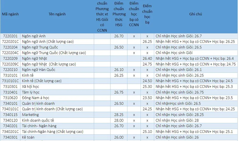 Trường lưu ý, thí sinh đăng ký xét tuyển phương thức học sinh giỏi có chứng chỉ ngoại ngữ đủ điều kiện trúng tuyển (trừ điều kiện tốt nghiệp THPT) đối với tất cả các ngành đã đăng ký.