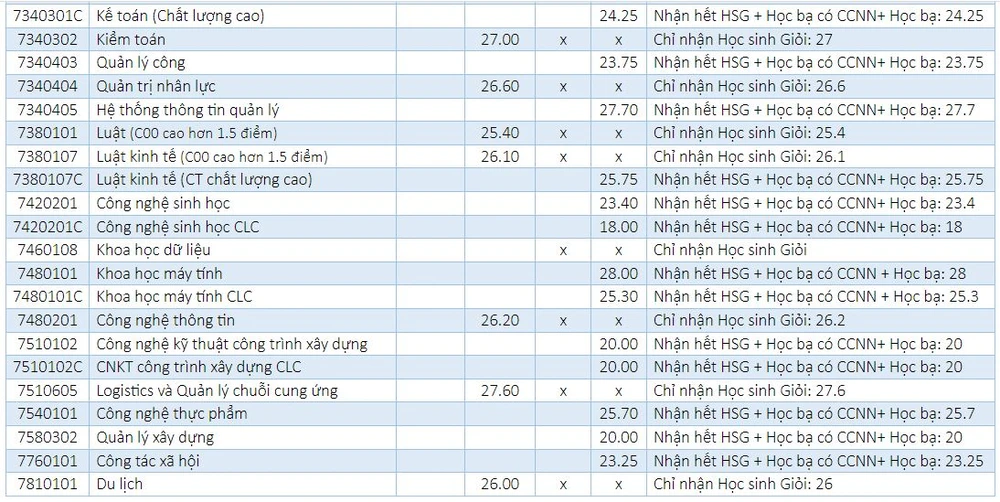 Theo đó, ở phương thức xét học bạ, ngành có điểm cao nhất là Khoa học máy tính với 28 điểm. Còn ở phương thức xét tuyển học sinh giỏi, ngành có điểm chuẩn cao nhất là Marketing với 28,25 điểm.