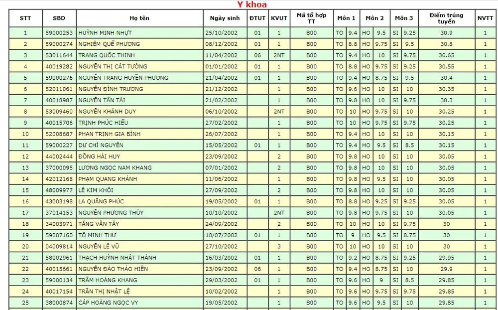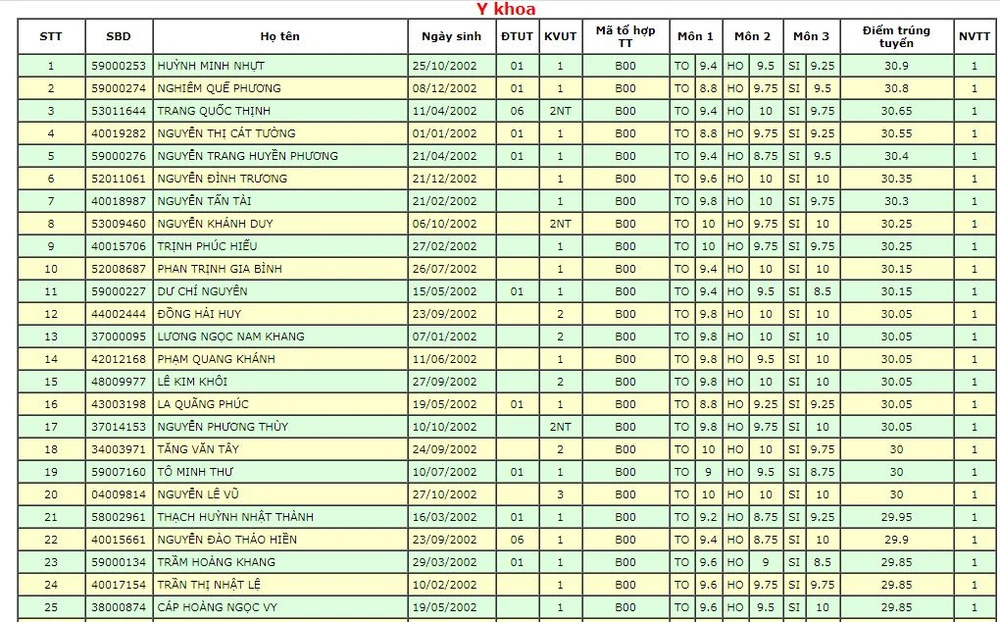 Ở ngành Y khoa, có đến 142 thí sinh có điểm tổng ba môn xét tuyển và điểm ưu tiên từ 29 điểm trở lên. Trong đó, có 20 em từ 30 điểm trở lên và cao nhất là 30,9 điểm.